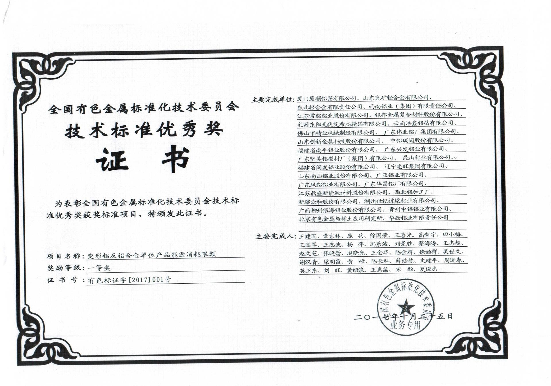 技術標準優秀獎證書